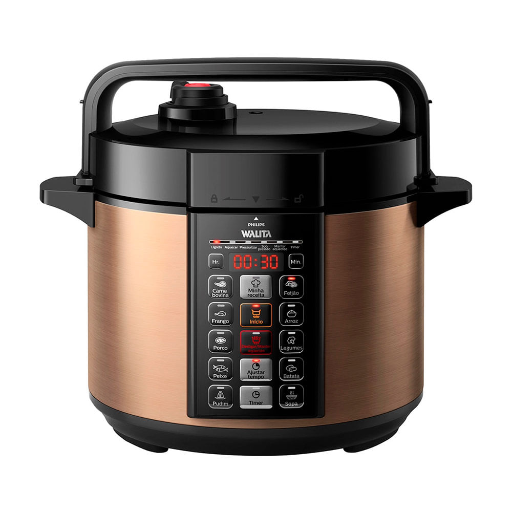 Moderna, prática e supersegura a Panela de Pressão Elétrica Digital possui 8 sistemas de segurança, desligamento automático, timer, 10 programas + “Minha receita", preparo perfeito de carnes, aves, legumes, arroz, pudim e muito mais. Recipiente interno antiaderente de 5L e externo revestido em aço inox. Válvula reguladora que permite cozinhar com ou sem pressão ou apenas liberá-la. Botão Timer, programa o preparo dos alimentos com até 24h de antecedência. Indicador sonoro que avisa quando o alimento está pronto. Tempo ajustável de 0 a 60 minutos para manter pressão. Preparo sem pressão que permite refogar os alimentos.